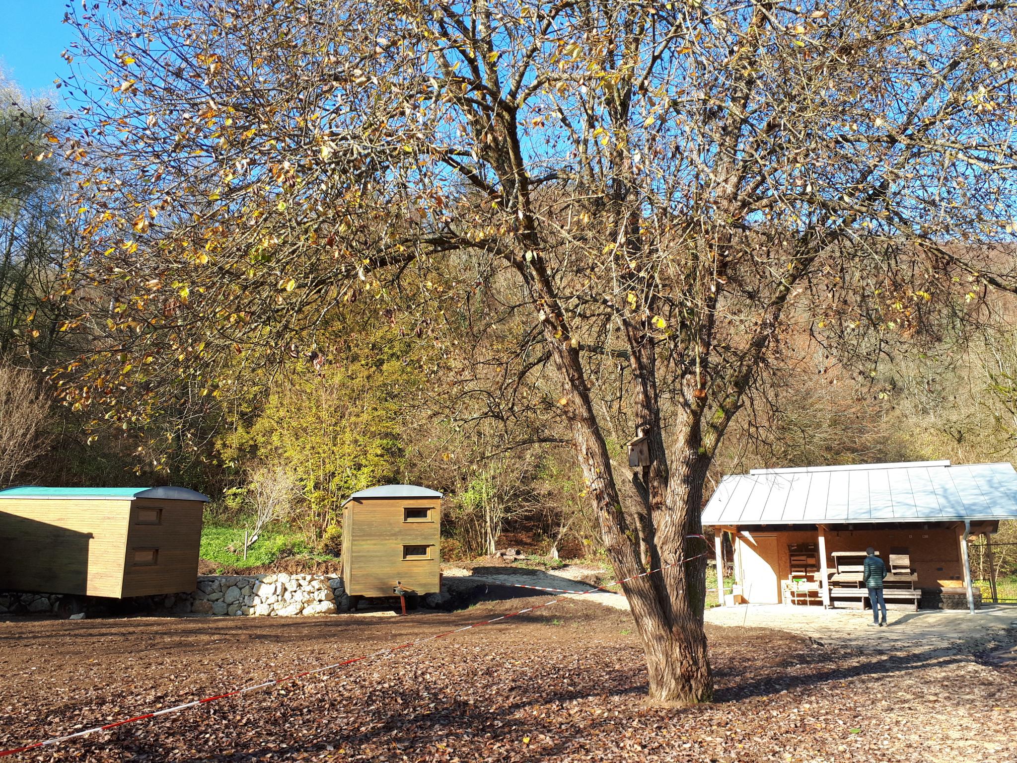 Gleichzeitig haben wir unsere "Bauwagen-Hotels" 2025 waldrandnah aufgestellt. Die vier, vor fünf Jahren gebauten, - barrierefreien - Hotel-Bauwägen bieten Platz für 4 Personen und sind im Inneren, auch unbeheizt, in der Übergangszeit mollig warm!