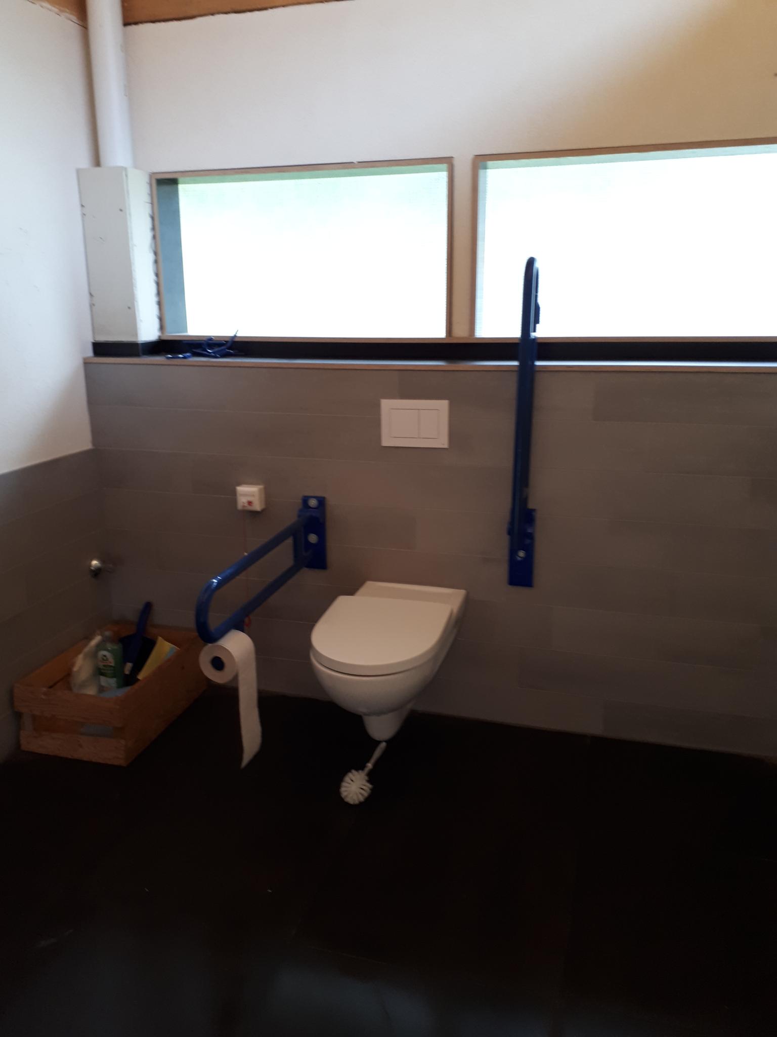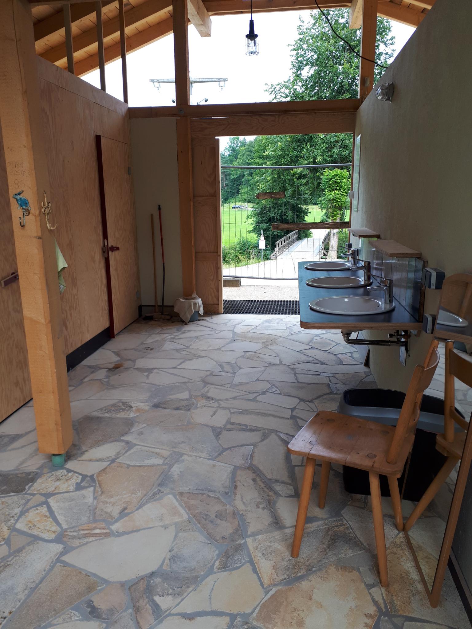 Das Sanitärgebäude wurde deshalb auf zwei eigene Bauabschnitte aufgeteilt. Der Erste wurde in 2025 fertiggestellt. Damit ist auf dem Gelände eine barrierefreie Toilette und Dusche in einem festen Gebäude untergebracht. Die zusätzlichen Aussenwaschbecken bieten weitere Wasch- und Abspülgelegenheiten.